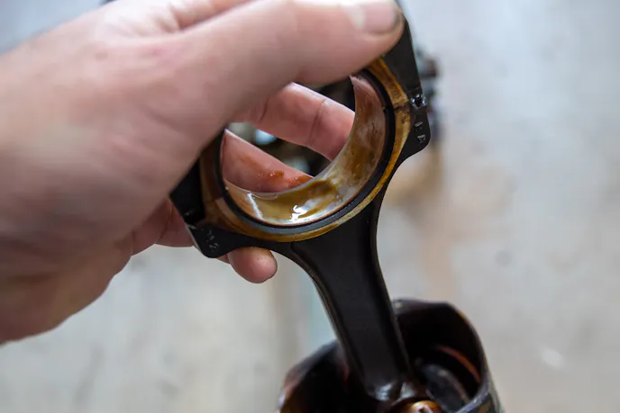 With the pistons in place, we first checked our rod bearing clearances again with Plastigauge. We then torqued the rod bolts to 15 lb-feet of torque and rotated the bolt 85-degrees since we had the second design rod bolts.