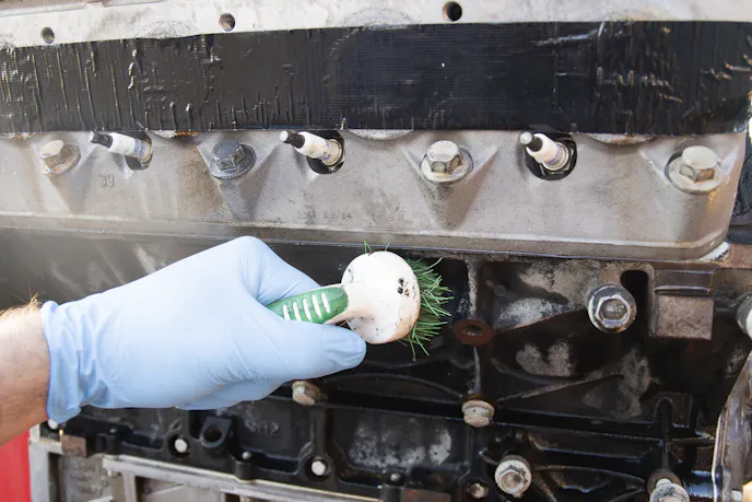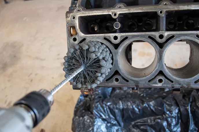 It was apparent the cylinders had a lot of miles on them because the cross-hatching was no longer visible. Cross-hatching is crucial because it ensures proper piston ring lubrication. We used a 4-inch, 240-grit ball hone to deglaze the cylinders. If you don’t already own a ball hone, then it might make sense to have a machine shop handle this process for you. It’s relatively inexpensive, depending on your machine shop.