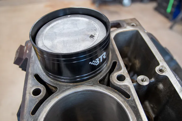 Since the piston rings were so dirty, it was easier to replace them rather than try to save them. We had KPE remove them for us before cleaning the pistons. We used a set of Mahle standard bore rings in conjunction with the factory pistons. After clocking the piston rings correctly, we then lubricated them with oil and inserted the piston and rod assembly in the cylinder using the Brian Tooley Racing ring compressor.