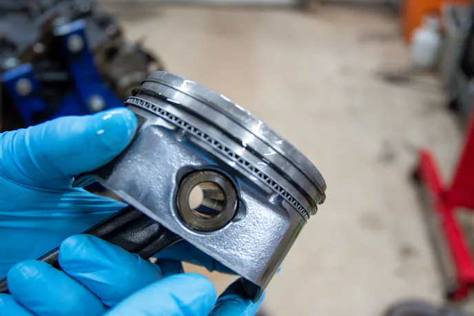 With the King main bearings and crank in place, we checked out clearances with Plastigauge, the original main bolts, and a torque angle gauge. While Plastigauge is not the best method for checking clearances, it’s close enough for what we’re doing. With the bearing tolerances to our liking, we cleaned the Plastigauge off and then lubed the main journal bearings with Melling’s engine assembly lube and put the caps in place. Make sure to note the orientation of the main caps on the LS upon reassembly. You can see in the picture that the number five cap is positioned in a different direction than the others. With the old bolts out, we inserted new factory GM torque to yield (TTY) bolts in the mains and reused the bolts on the engine’s side. With the crankshaft secured, we moved our attention to the rods and pistons.