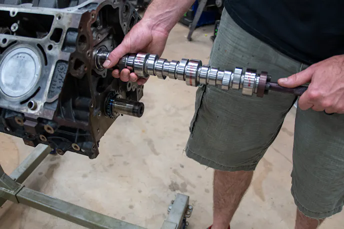 Before we removed the cam, we pulled the oil pump and factory timing set from the engine. Using a handy cam removal tool (PN CSIT-LS) from Melling, we bolted it to the camshaft with the supplied hardware. This device makes it easy to remove the cam, giving you enough leverage to finagle it out without disturbing the cam bearings. With the OEM unit removed, we were able to inspect the lobes, which showed slight wear. The cam bearings were a different story and had to be replaced.