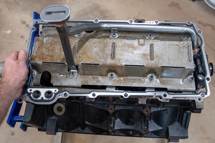 After we centered the oil pump per Melling’s method, we then torqued the pump to the block and installed the windage tray and a new pickup tube (PN 324S). It’s imperative that the pickup tube stays in place for the life of the engine. And while one bolt does the job from the factory, Melling offers an oil pickup tube bracket (PN M29500) that increases the clamping force making sure it will never come loose. With the bracket in place, we were finally ready to button up the bottom end and install the oil pan.