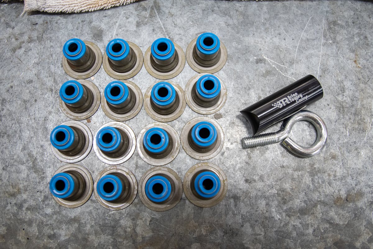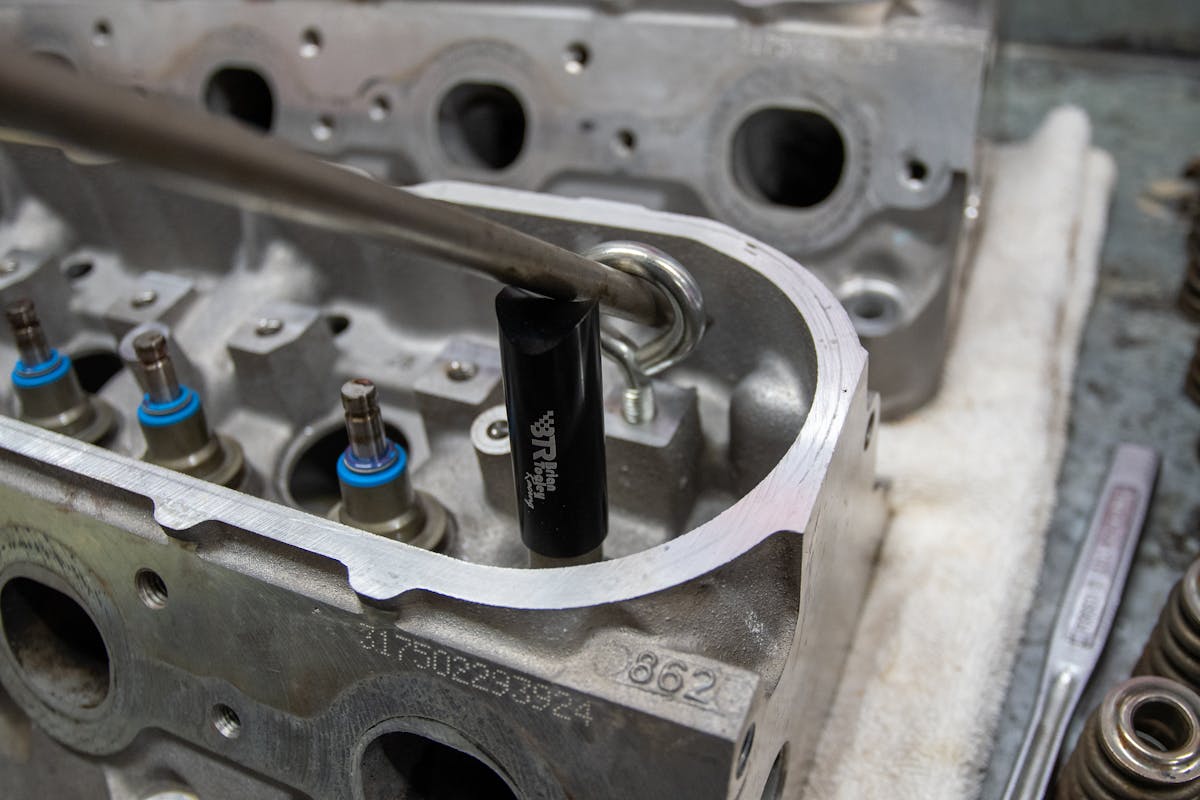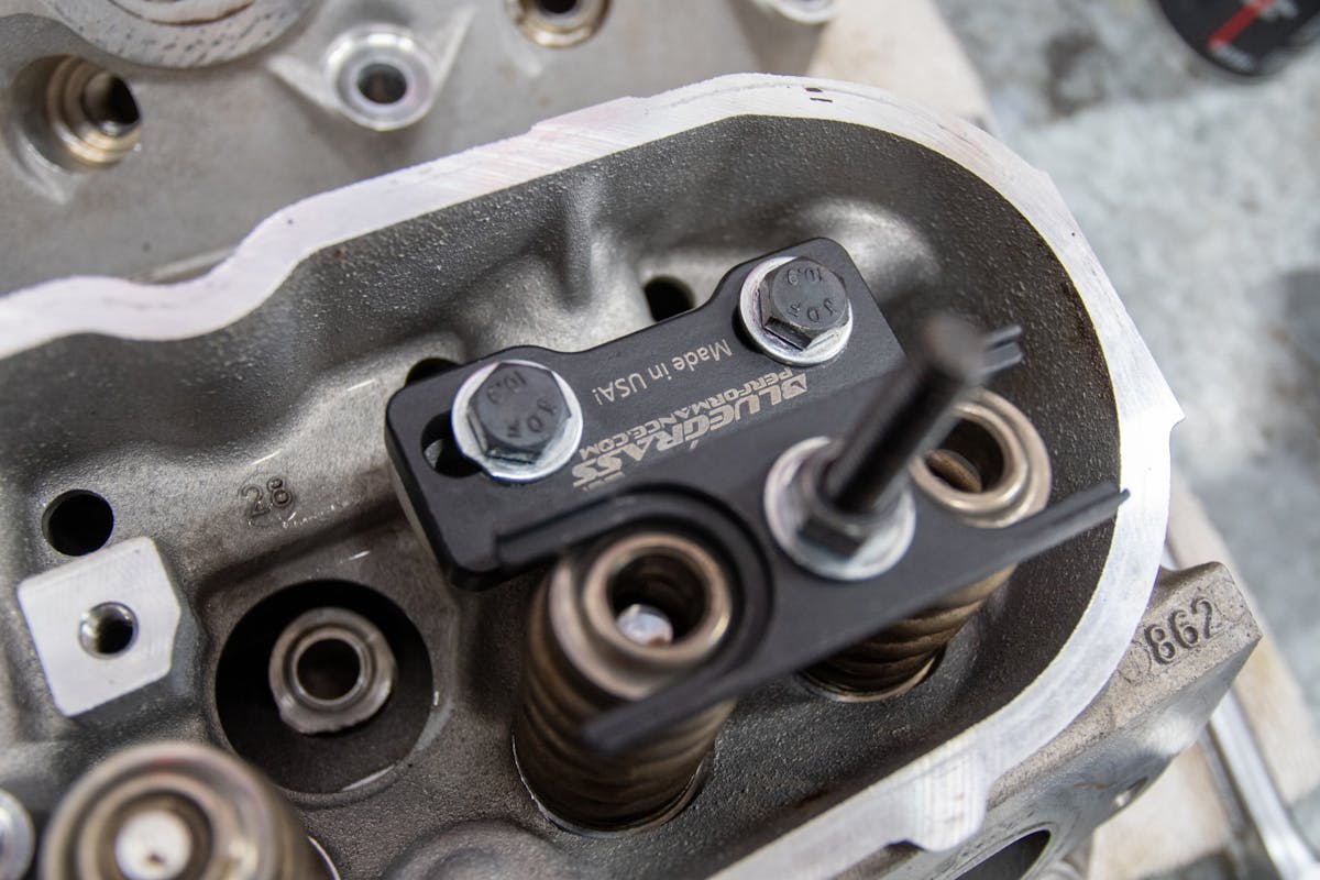 The next obstacle was the valve seals. Removing these items is pretty simple and can be done with a pair of vice grips. The old units popped right off with little effort. However, installing them can be a more complicated process if you don’t have the correct tool. Luckily we did, thanks to Brian Tooley Racing’s valve seal installation tool. This $9.99 tool is worth its weight in gold, as it makes the installation process quick and super easy. With the new seals in place, we then reassembled the heads using new locks (PN VL-760) and retainers (PN VSR-709) from Melling.