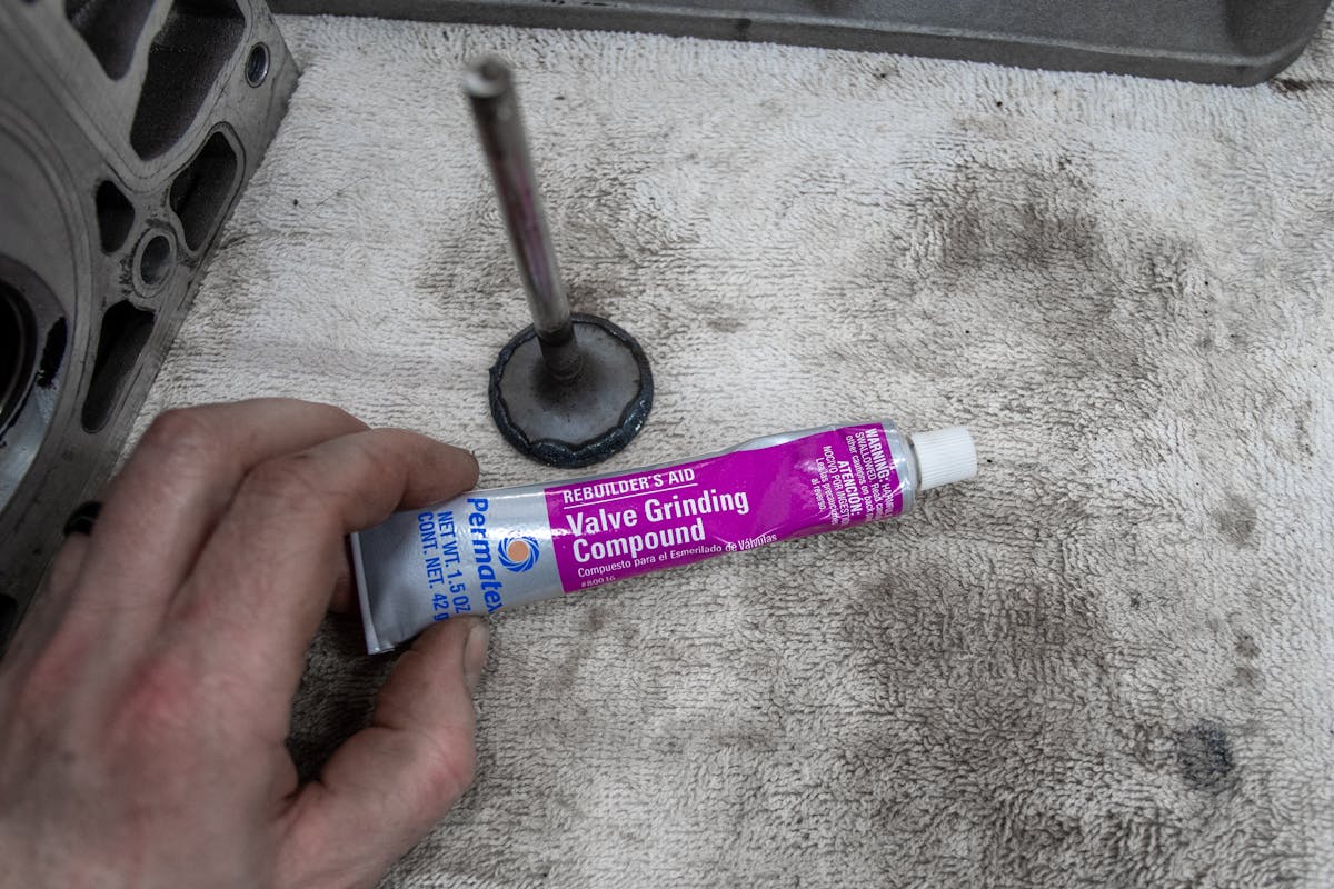 With the paste on a valve’s seat area, we slid the valve stem through the head and inserted it in the chuck of a cordless drill. As we spun the valve with the drill, we pushed the valve into the seat several times and then checked the finish. After all of the carbon and grime were removed from both areas, we moved on to the next valve. The paste did a fantastic job and made quick work of our high-mileage valves.