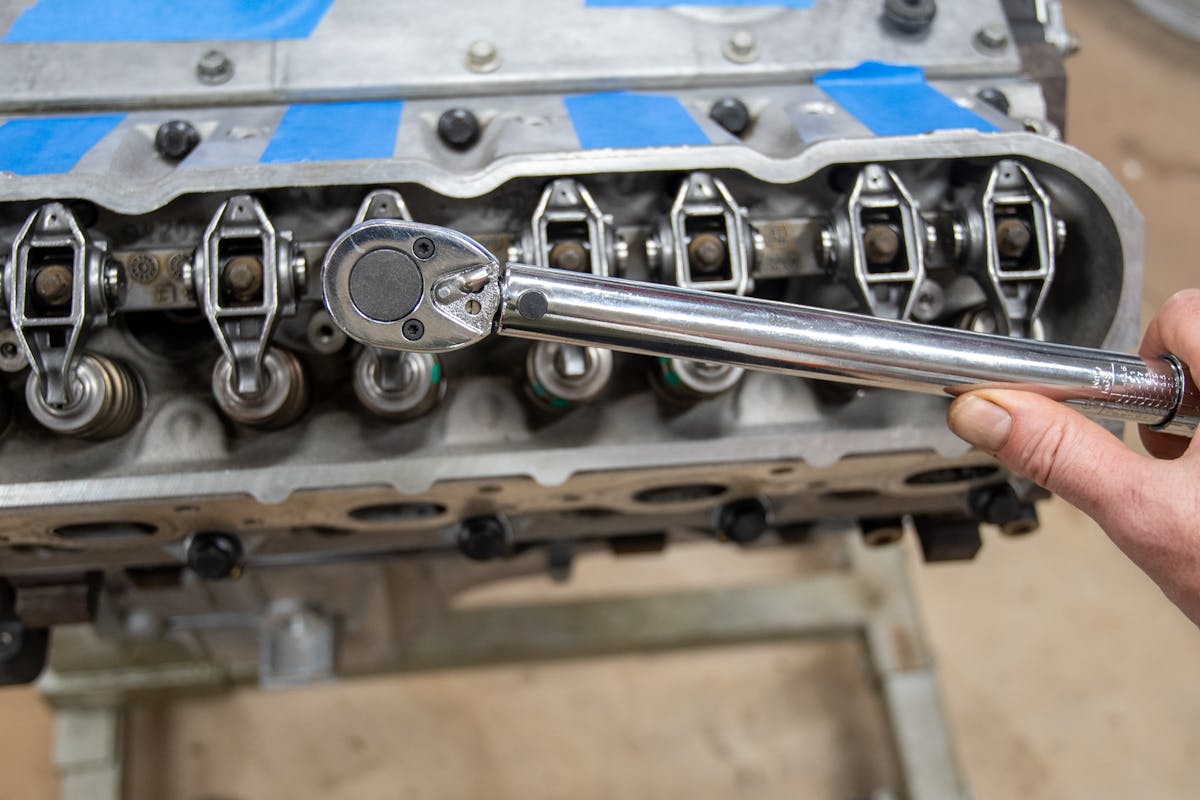 Now that the heads are buttoned up on the engine, it’s time to tackle the rest of the valvetrain. The LS engine’s rocker arms and pushrods had seen better days, and since they were worn and dirty, we replaced them with new Melling units. Melling’s rocker arms (PN MR-1341) are a direct replacement, as are the pushrods (PN MRP-614). We first dropped the pushrods in place and then the rocker pedestals and rocker arms. We then torqued the rockers to 22 lb-ft of torque.