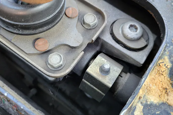 This caused two issues. First, there is no way to loosen the collar from the top side, because the bolt is upside down, and there is no way to get at it from the bottom, with the torque tube and exhaust installed. That also explains why the shifter pops out of gear — there was no way to adjust the shifter once everything was installed, so that misalignment was never addressed.