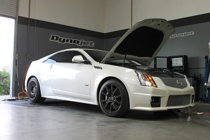 Before we got to work installing the coils, we strapped the car down on our DynoJet 224xLC chassis dynamometer to get some baseline horsepower numbers. Keep in mind that our CTS-V already has the Lingenfelter 378 CID LSA Supercharger Upgrade and a larger Lingenfelter intercooler package with dual 2-speed SPAL fans, so our starting point is going to be a lot higher than the baseline numbers for a factory car, obviously.