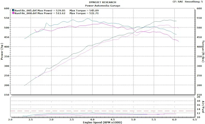 When we saw the dyno graphs after the pull we couldn’t believe how much of a gain these SOS coils gave our CTS-V – a gain of 26.4 horsepower and 24.1 pound-feet at the wheels! That brings the CTS-V’s power output up to 539 horsepower and 545.8 pound-feet to the ground!