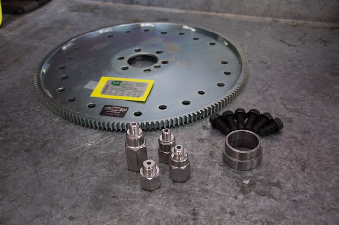 The new TCI torque convertor would not bolt up to our factory 5.3-liter flexplate without enlarging the holes, so we called ICT Billet to see what the best options were. The guys recommended (PN 551356X), which is a PRW unit that is SFI 29.1 certified. They also suggested the converter hub flexplate crankshaft adapter (PN 551165). This hub allows the 4L80e convertor to center itself in the flywheel and will alleviate any movement or vibration with the torque converter upon acceleration or deceleration, thus avoiding transmission damage.