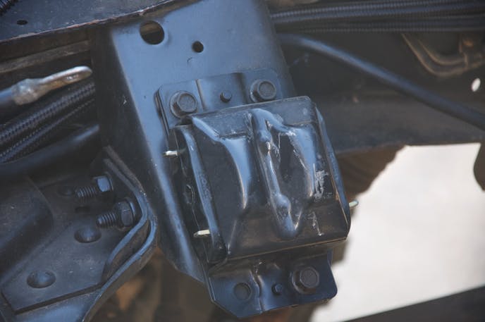 With the engine bay all cleaned up and the transfer case on the workbench, we decided to go ahead and install the engine and transmission. For the engine mounts, we used Hooker clamshell mounts (PN 71221004HKR), Hooker polyurethane mount inserts (PN 71221014HKR), and Hooker engine mounts (PN 12621HKR). They bolt on to the factory location with no problem. Holley offers a 2WD transmission cross member for use with the 4l80e in the Square Bodies, but we were unable to use it due to transfer case interference. Luckily, we were able to use the factory cross-member with just a minor modification, moving it back about 2-inches and drilling new holes. The engine and transmission fit in the Suburban perfectly…well, almost. We did have to modify the frame to clear the front driver’s side of the factory oil pan. This required a torch and the persuasion of a ball-peen hammer.