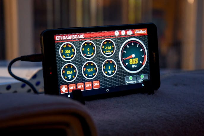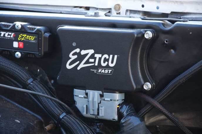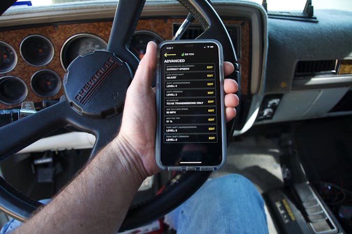 Third, the Pro-Flo 4 that we used will not support an electronically shifted transmission (stay tuned for a new product from Edelbrock that will address this problem) — so we needed a TCU that would take care of shifting duties. We got in touch with TCI and ordered the EZ-TCU. This controller allows for maximum control over shift points, shift firmness, shift speed, and is ready to go right out of the box. The unit is also fully programmable based on load, speed, and RPM. TCI just released a wireless version of the EZ TCU (PN 302600) allowing you to connect and tune the controller via Bluetooth. The app is easy to use and just super cool. With the Bluetooth capabilities of the Edelbrock Pro-Flo 4 and the EZ-TCU, we can monitor our drivetrain by way of our dash-mounted tablet.