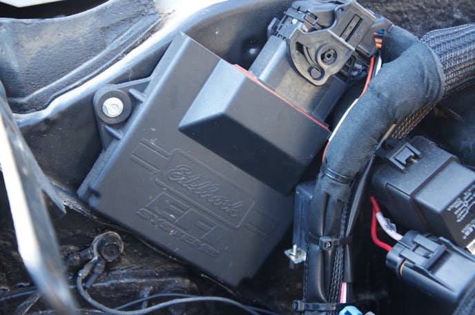 First, we mounted the ECU to the firewall and then plugged in the harness connectors. With this system, there are only a few wires that need to be hooked up for operation, power, ground, accessories, fuel pump, and electric fans, if required. We already had the system wired from our previous dyno session, aside from the oxygen sensor. We routed the sensor wires away from the headers and threaded the sensor into the header. At this point, the engine is ready to fire up. This was by far the easiest part of our swap, thanks to the simplicity of the Pro-Flo 4.