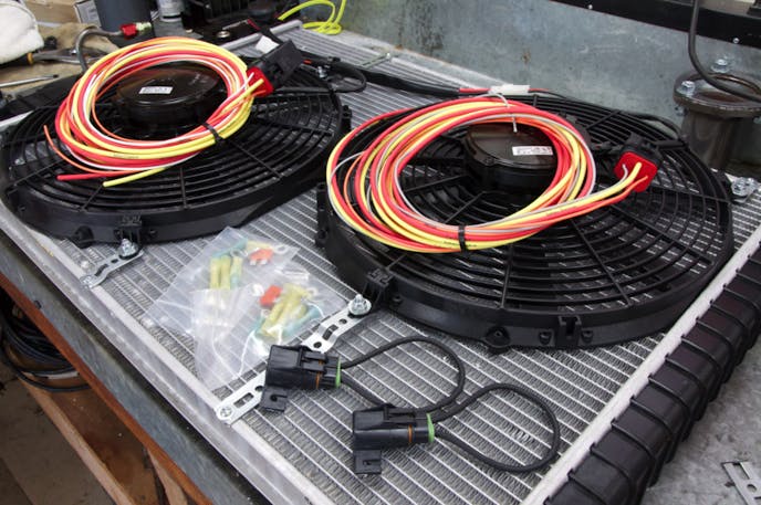 After the engine was in place, this was an excellent time to get our cooling situation under control. We used the factory Suburban radiator, but we ditched the clutch fan system for electric fans. We chose to use dual 14-inch fans from GC Cooling. These units came with all of the mounting hardware needed along with heavy-duty wiring harnesses and relays. We followed the instructions and wired the fans to the Edelbrock Pro-Flo 4. The ECU will be able to control the fans independently of each other and allows the user to select the temperatures for fan activation.