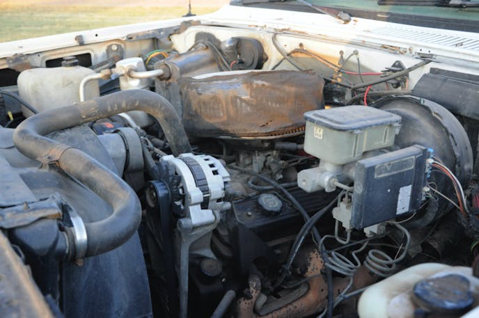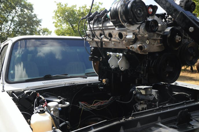 Our first order of business was to yank the 350 out of the engine compartment and make way for the new powerplant. There’s really nothing complicated about this process on an older vehicle, however, we had the archaic TBI system on the ’91, which forced us to chase a few wires, because we need to retain the electronic speedometer, water temp gauge, and oil pressure gauge. Luckily, we were able to find wiring schematics online that allowed us to trace out the wires, showing routing and color codes.