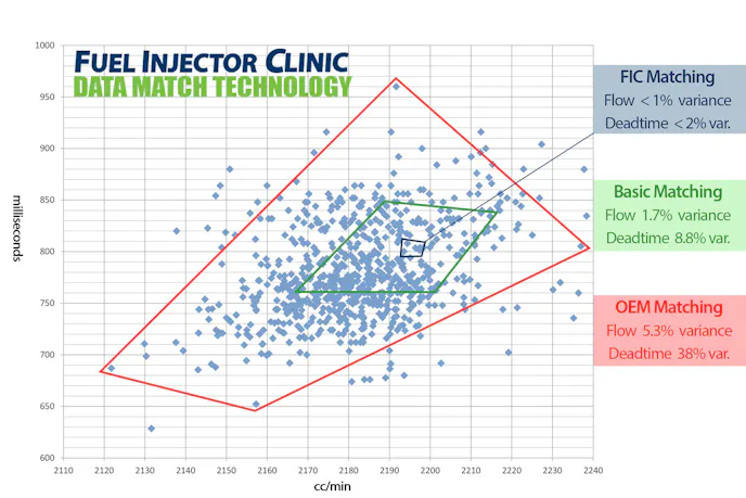 Each dot represents one injector that was tested out of a large batch. Every injector was tested for both slope flow value and latency value, and this graph helps to illustrate how much injectors can vary from one another with only OEM matching, or even with basic matching. FIC precisely matches each set using our custom flow benches in order to offer consistent quality.