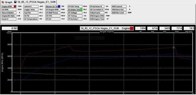 The water temperature reached a peak of 168 degrees, which is much lower than what a car typically runs at. These are great numbers considering it was around 90 degrees outside during our venture at Las Vegas Speedway – where the car ran a best of time of 8.24 at 168.1 mph.