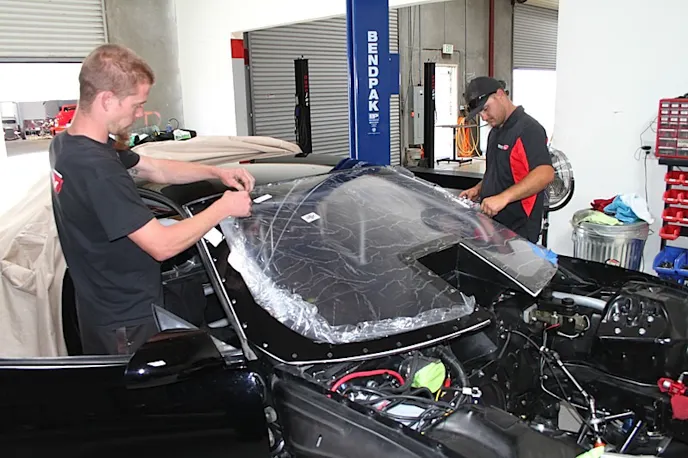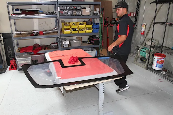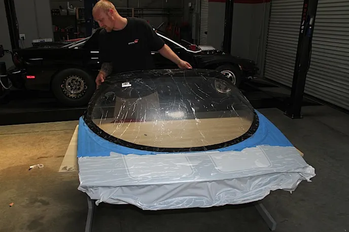 After our windshield frame had been cleaned, Tim and Dean began carefully test-fitting the composite piece to our Camaro. Even though ours is a direct-fit unit, it’s best to always make sure that all four corners line up properly. It’s also strongly advised to leave the applied shipping plastic attached to both windows to prevent any unnecessary scratches to the throughout the installation process.