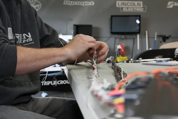 “We strain-relieve all of the crimps where the wire enters the pin that goes into the connector. Those all have a wire crimp and insulation crimp. The insulation crimp is the part of the pin on the back that goes over the plastic, and the purpose of that strain-relief is that if you pulled the wire, it’s holding on to the insulation, not just the copper, because the copper will work-harden and break,” said Jordan.