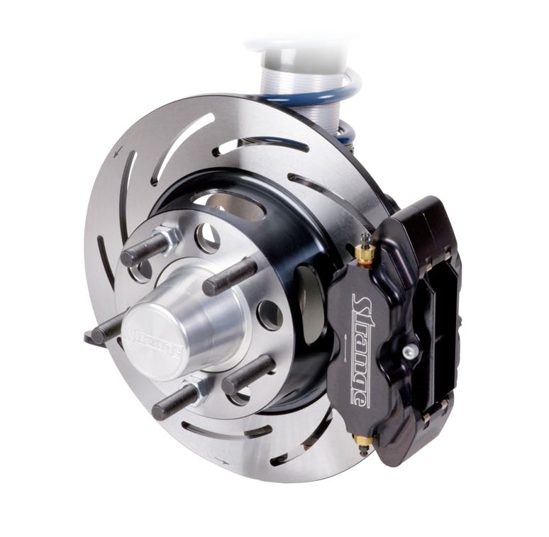Strange’s Pro Race rear brake kit is also installed on the housing at the Strange facility. It includes aluminum calipers and solid slotted-surface 11.25-inch brake rotors, along with brake pads and billet caliper mounts.