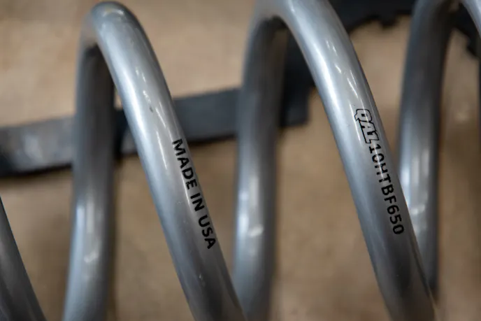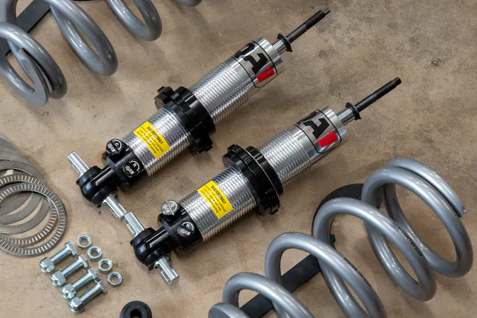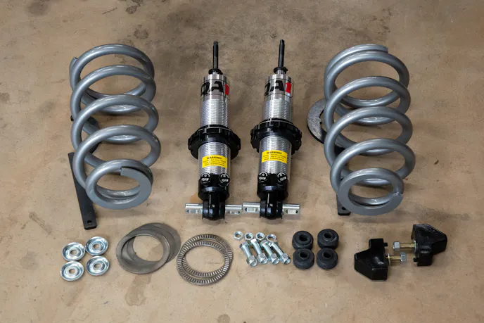 The conversion kit for full-size GM trucks includes two 650-pound springs, two coilovers, two aluminum lock nuts, two aluminum spring seats, two bump stops, and all of the hardware needed. We did add the optional thrust bearing (PN 7888-108), which is recommended in the QA1 coilover instructions for ease of ride height adjustability. We were also excited to find out that this kit is made right here in the U.S.