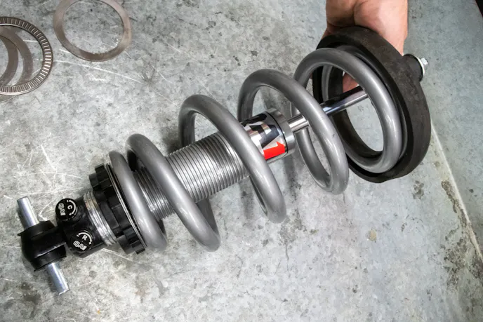 Next, we slid the thrust washer and springs over the coilover and seated them with the spring seat collar. Now, insert one washer and shock bushing on the top of the shock. At this point, the coilover assembly is ready to install on the truck. You will need to remove the rubber isolator off the factory spring and place it on top of the QA1 springs before inserting the assembly into the frame.