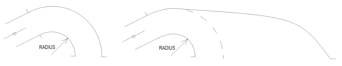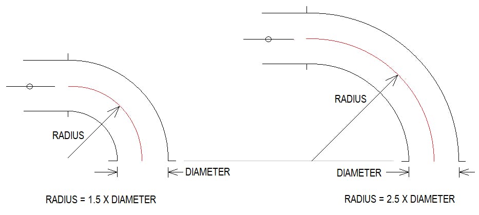 He also adds that when flow through a bend is important, a bend radius that is at least 1.5 times the diameter should be chosen. For a throttle body that is approximately 4-inches (101.6mm) with a bend radius that is 1.5 times diameter, the inside radius of the turn is 4-inches (8-inch diameter). Notice that when the bend radius is 1.5 times diameter, the inside radius of the turn is the same as the diameter.