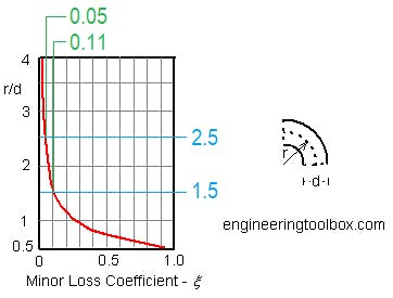 Schmidt also explains that the image below quantifies the flow through a bend with a flow coefficient. The vertical scale of the graph is r/d (the bend radius centerline/duct diameter).