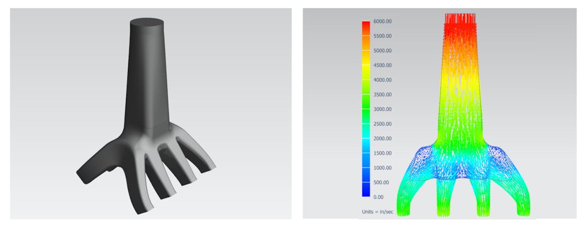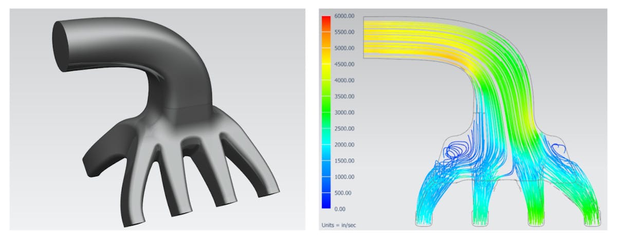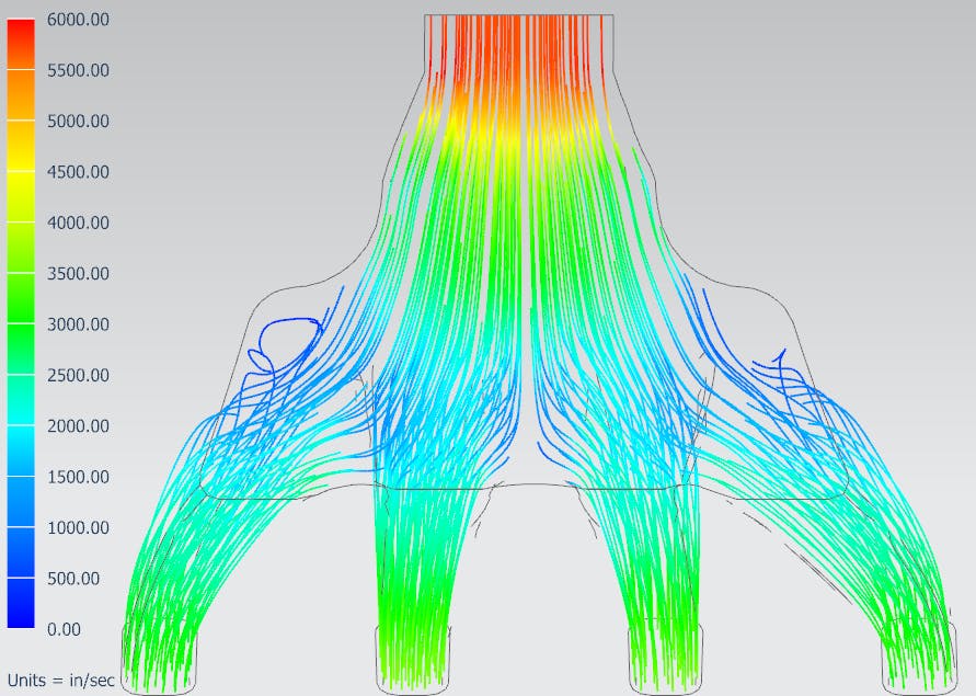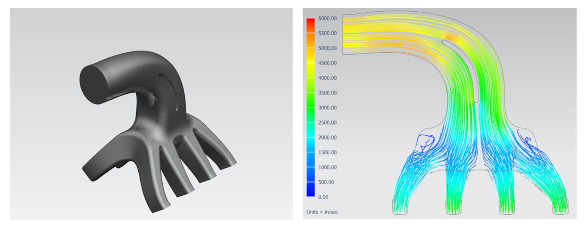 After nailing down runner length, CID started looking at how the air goes from the carburetor pad to the rest of the cylinders. “With our manifold, a lot of it came down to determining what the best way was to get the air to distribute itself from the opening to the cylinders with as little disruption as possible,” Konstandinou says. “So it’s basically about maximizing flow guidance to the runners with as little restriction as we can manage.” And that resulted in a manifold design with wide dividers to channel the air in a way that encourages even distribution amongst the cylinders while also keeping the air suspended as much as possible.