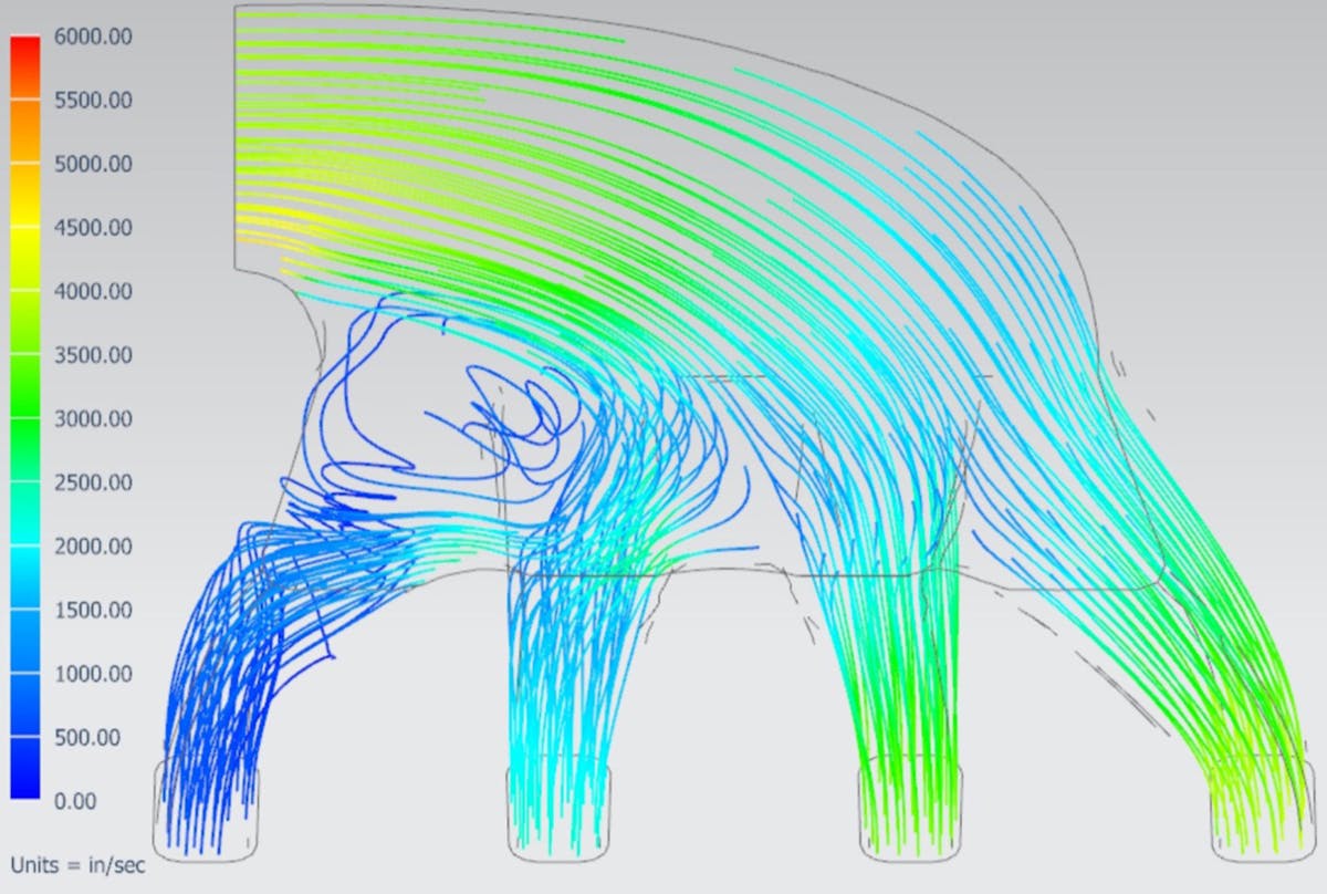 Konstandinou worked with John Schmidt, a design engineer whose resume includes companies like Siemens and Space X, to better understand the behavior of air in different intake manifold designs through Computational Fluid Dynamics (CFD) testing. Schmidt posited the following and notes that while this serves to explain the design considerations for forward-facing air-entry for an intake manifold, the same rules apply to tops for tunnel-ram style manifolds and intake designs with an elbow that attaches to the top of a manifold which has a carburetor flange.