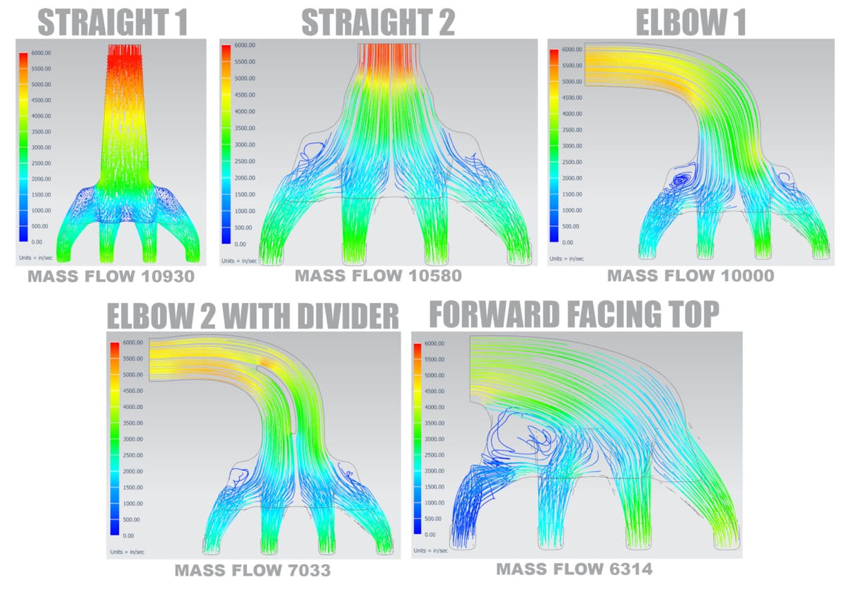 Schmidt illustrates that since airflow in a turn follows the inside radius, the inside radius is the most critical dimension regardless of the shapes surrounding it. “Some elbows and tunnel ram tops have an entry that directs the air to flow upwards before entering the plenum. CFD does not show any advantage to flow from this sloping trajectory. The only advantage is that it makes for more compact air inlet ducting.”