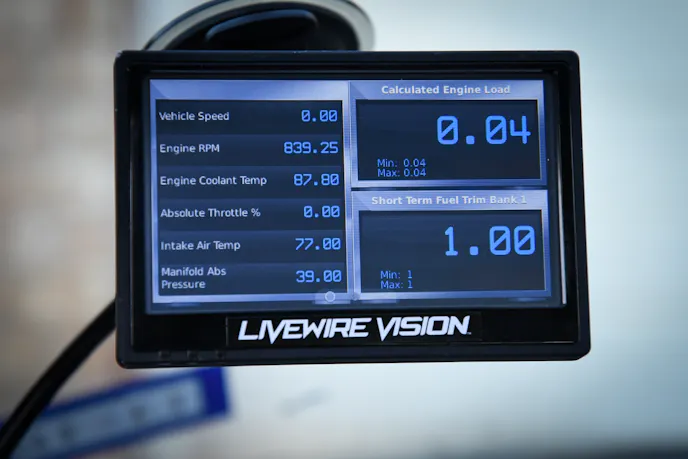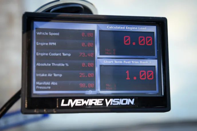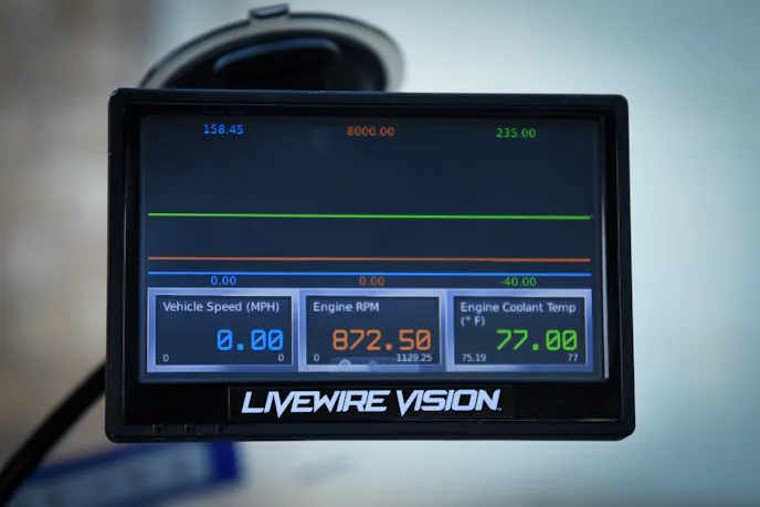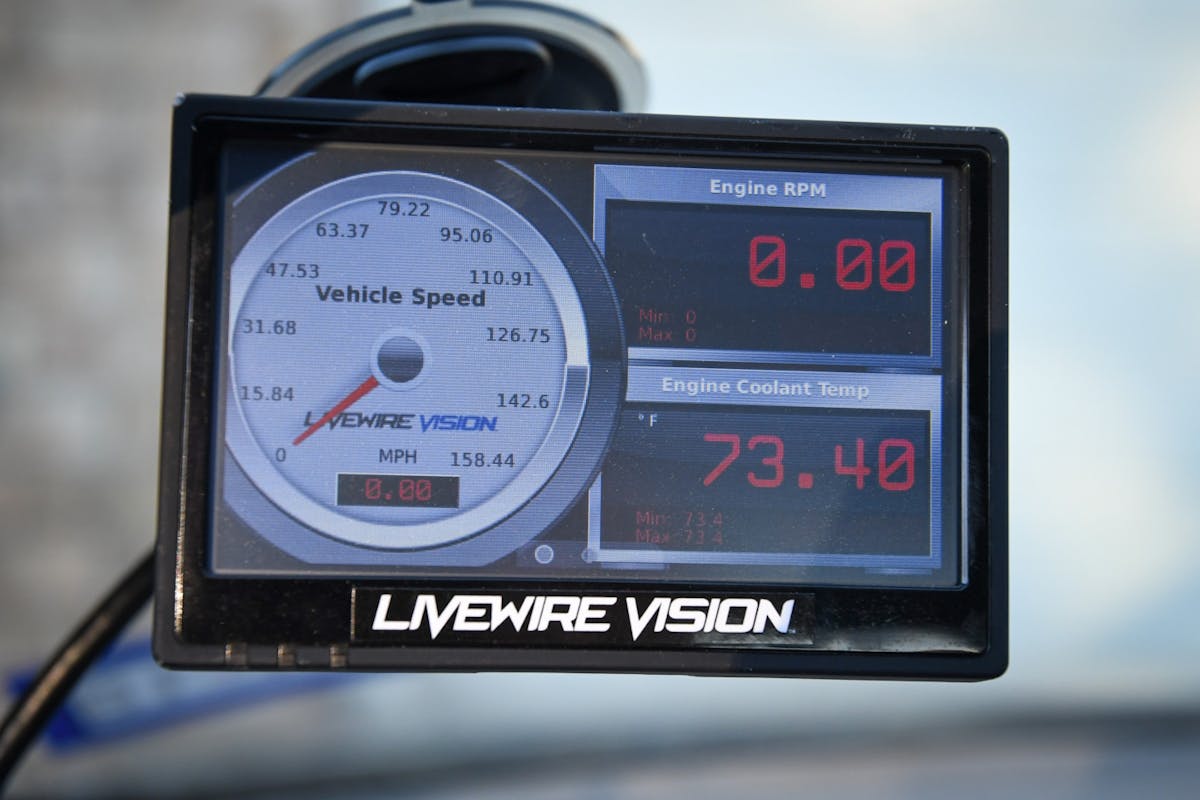 Just a couple of weeks ago, we loaded up for a substantial road trip in one of our projects, the Dirty Bird, on a 2,500-mile round trip to LS Fest West in Las Vegas. Since the car is now over 20 years old, we need a way to watch the engine and diagnostics as we cruise across America. With any old vehicle, you’re bound to experience a problem or two on a trip like this, and we did. We liked the idea of using the Livewire Vision instead of having to plug in a laptop in the already cramped cabin space to keep an eye on things. The compact design allowed us to mount the unit right on the windshield with the supplied suction cup mount. We hit the road early in the morning on our 16-hour drive from Texas with the product installed.