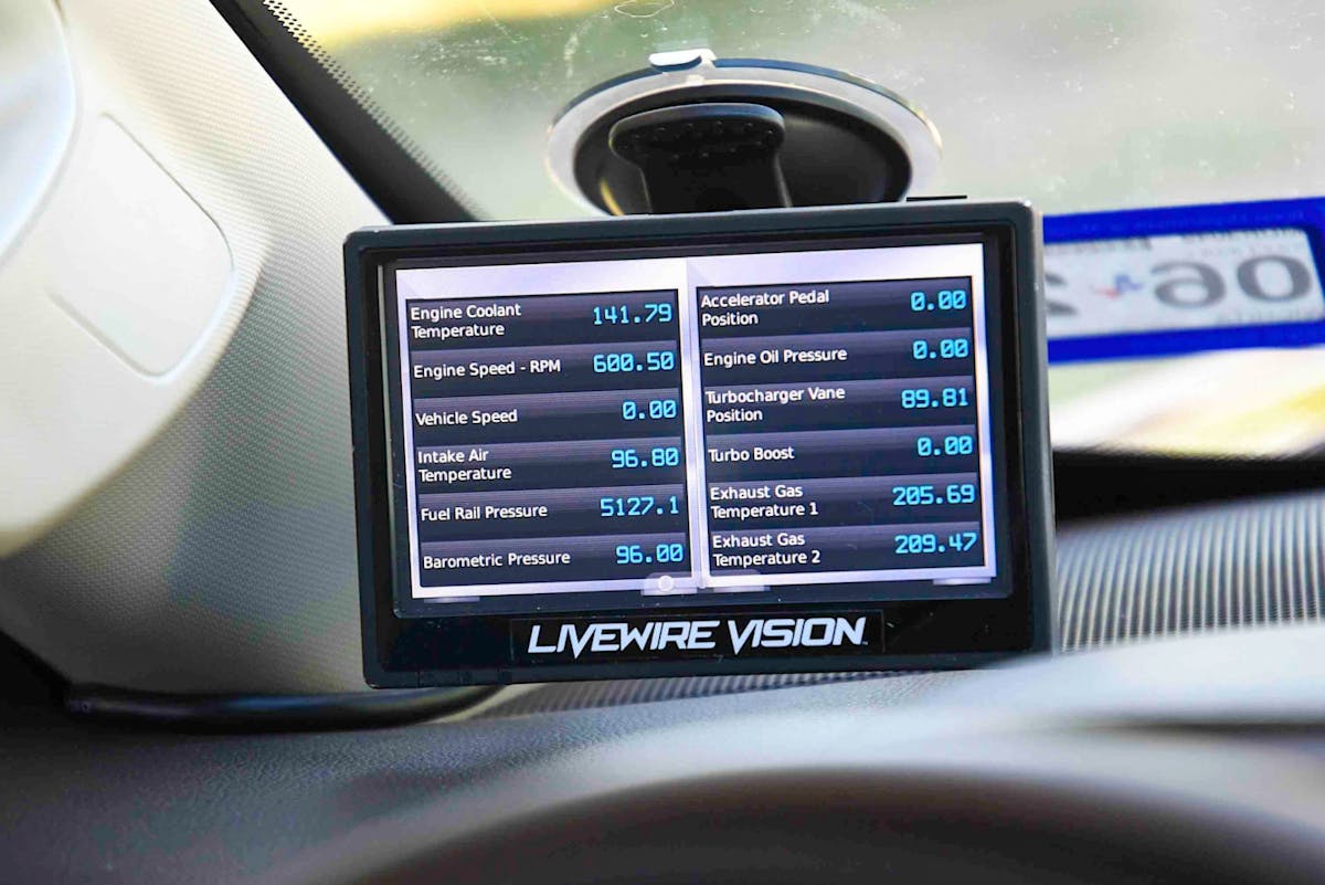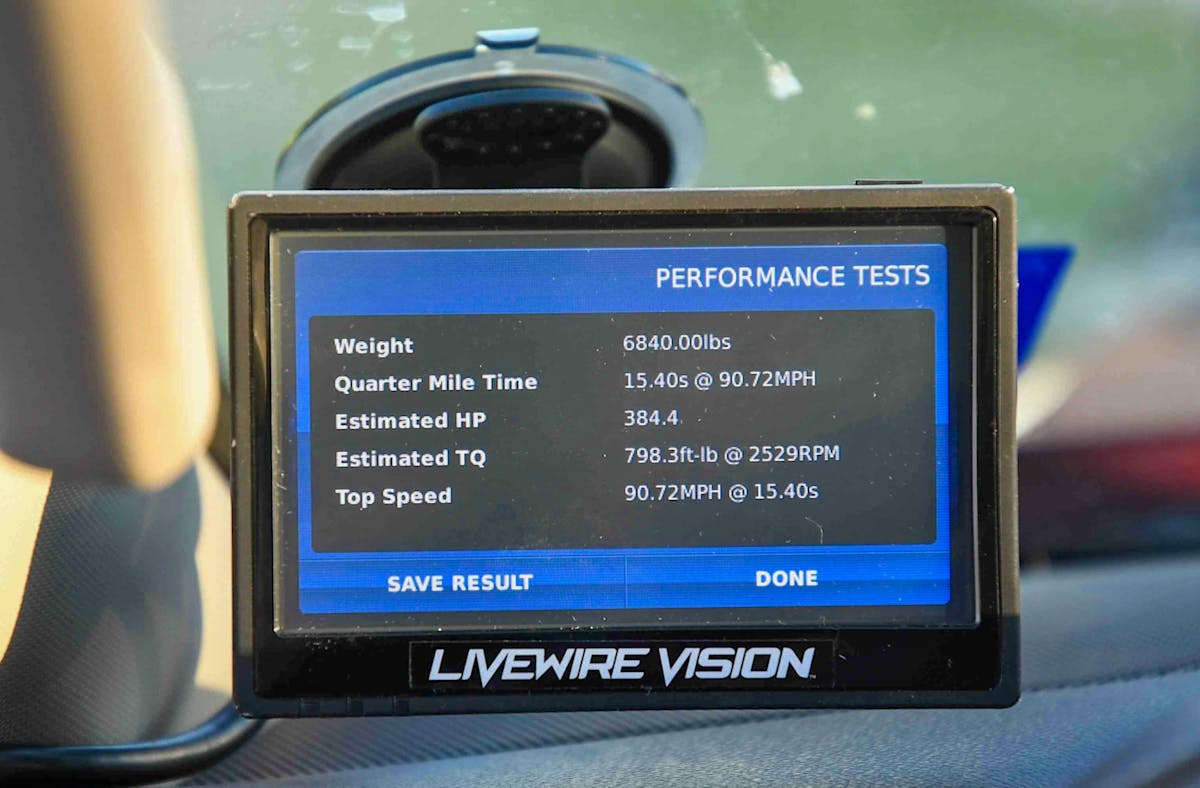 For this test, we pulled up as many parameters as possible to keep up with our trip. The Livewire Vision allowed us to monitor 12 different sensors at one time. We kept an eye on engine coolant temperature, engine speed, vehicle speed, intake air temperature, fuel rail pressure, barometric pressure, accelerator pedal position, engine oil pressure, turbocharger vane position, turbo boost, EGT 1, and EGT2. Of course, with the trailer unhooked, we had to see what our 1/4-mile times looked like as well. Let’s just say the truck beat our Caprice without much effort. We’re definitely putting a nitrous system on it now.