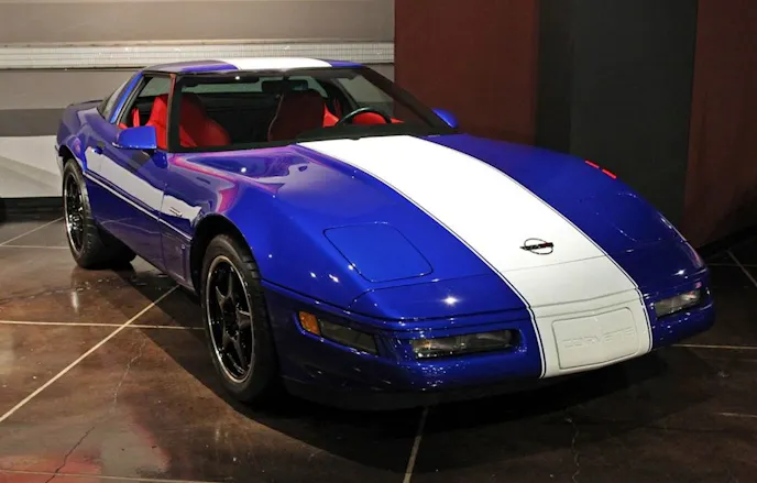 Thirty-three years later in 1996, the Grand Sport reappeared as a production car limited to a run of 1,000. The car would mark the end of the C4 and do so with an attitude. The cars were fashioned only with a striking Admiral Blue paint color, wide Arctic White stripe on center, and finished with the signature diagonal stripes in red, on the driver-side front fender. Both coupes and convertibles were fitted with a set of black spoke ZR-1 style wheels.